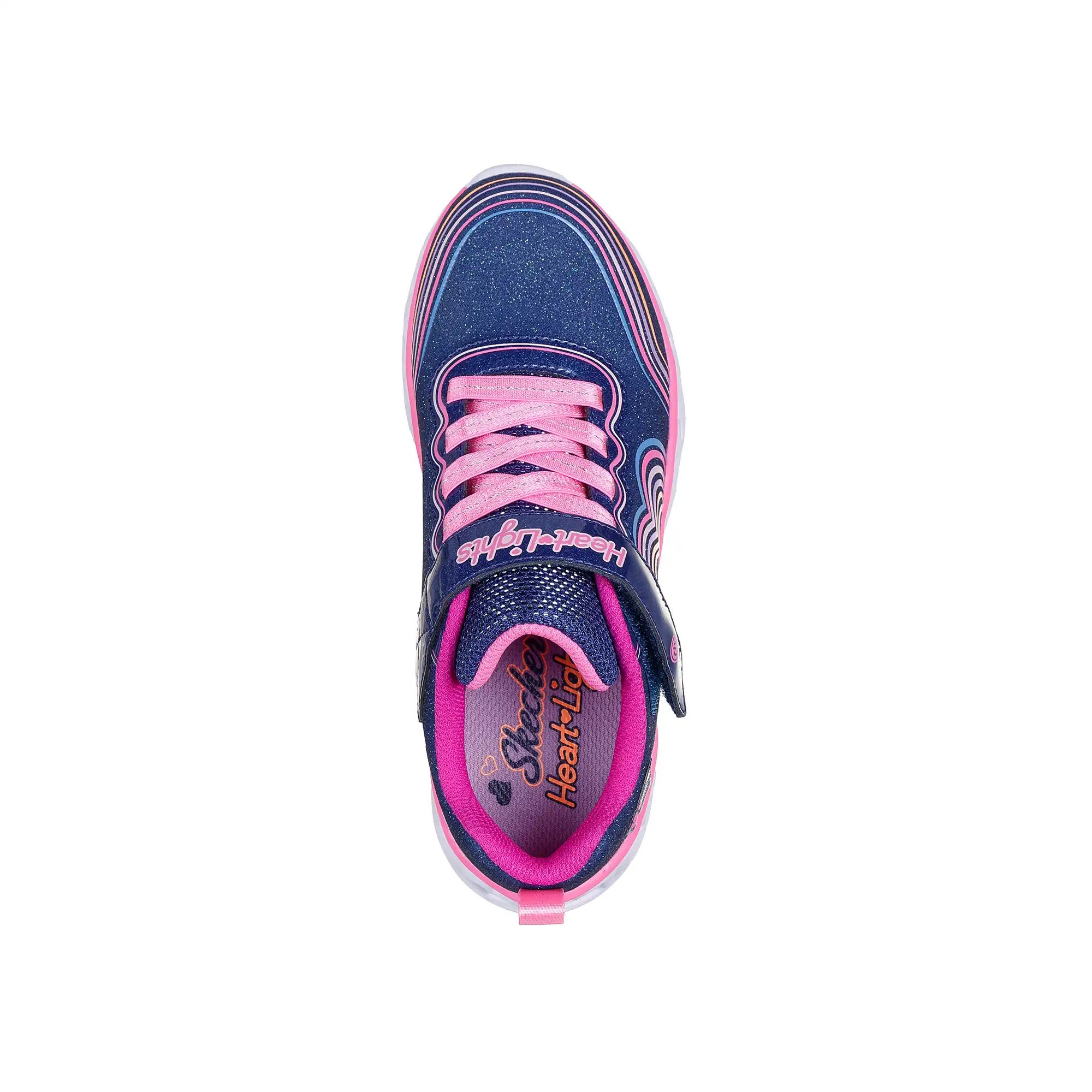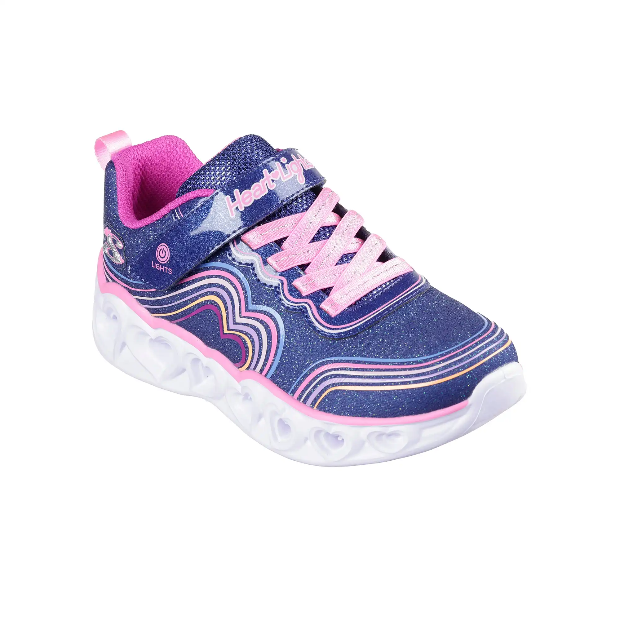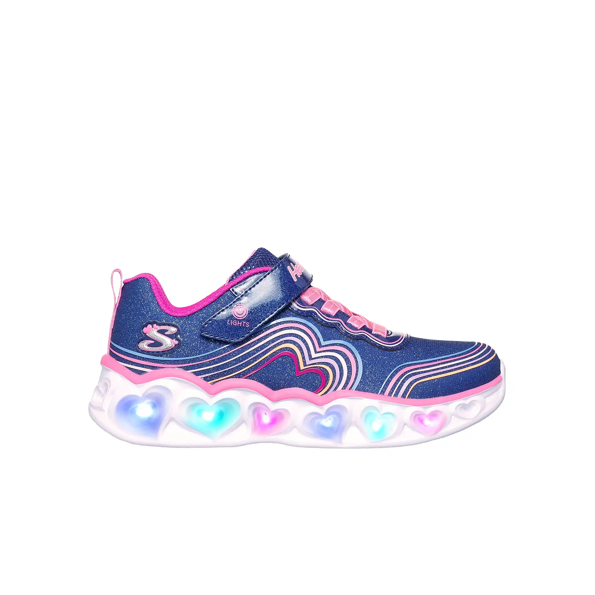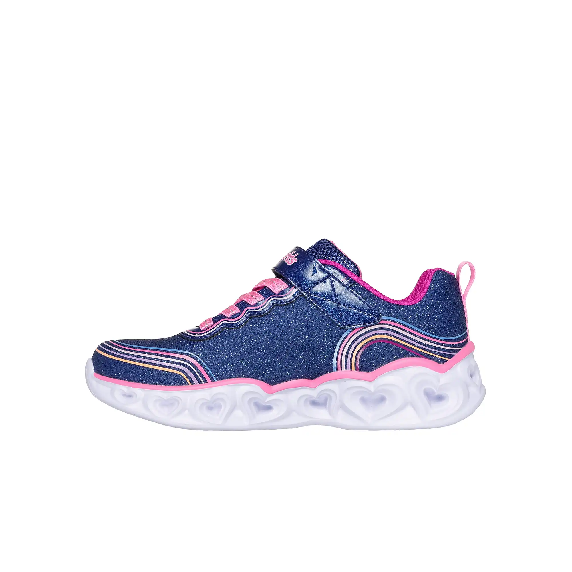 Ce modèle lumineux présente une tige en mesh scintillant avec un motif cœur arc-en-ciel 3D, des lacets élastiques, une fermeture adaptative Skechers pour un ajustement personnalisé, et une semelle intermédiaire sculptée lumineuse avec détail « chaîne de cœurs ».